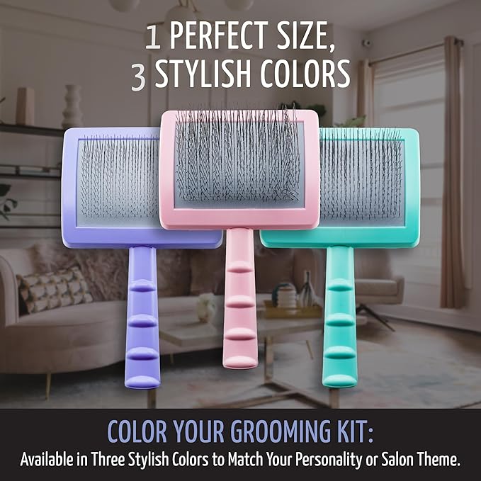 - Plastic Slicker Brush: Comes as one (1) durable pet brush with long stainless-steel pins and soft cushion pad; an essential for your pet supplies, cat grooming kit, or full dog grooming supplies collection