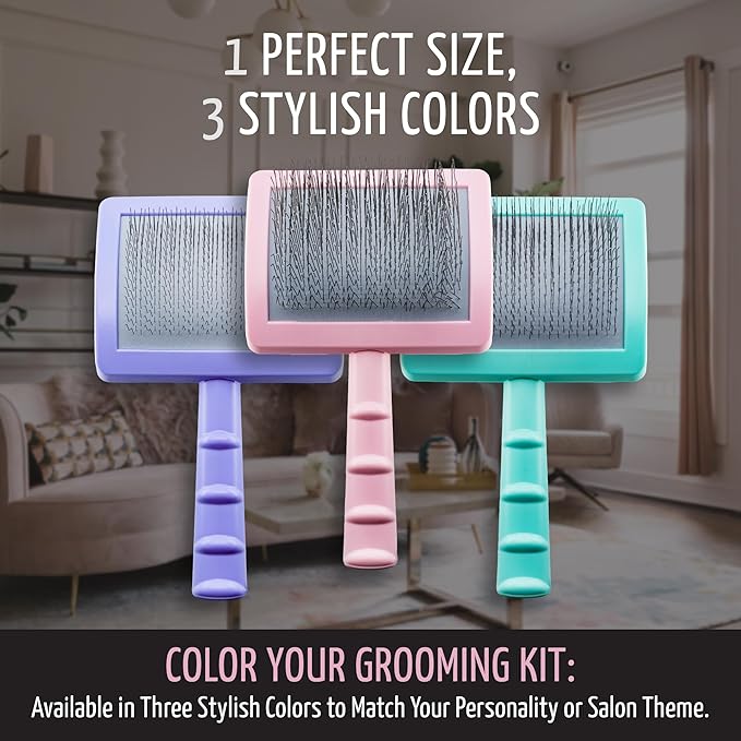 - Plastic Slicker Brush: Comes as one (1) professional-grade pet brush with stainless-steel pins and soft cushion pad; perfect for home grooming setups, dog grooming supplies, or your cat grooming kit