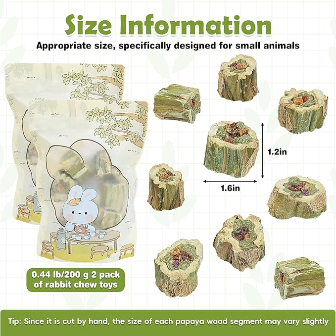 - Help with Teething: Rabbits' teeth grow continuously, and if they are not properly worn down, they may become too long, affecting their ability to eat and their health. Papaya wood rabbit chews are moderately hard, suitable for rabbits to grind their teeth and maintain dental health