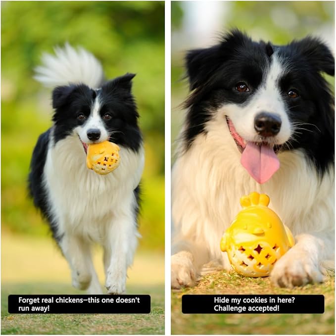 - Dog Training-Unique hen dog chew toy with air side outlets allow your pets smell the food easily and attract to chew it. Let your pet to find more solutions to take food when playing with it.
