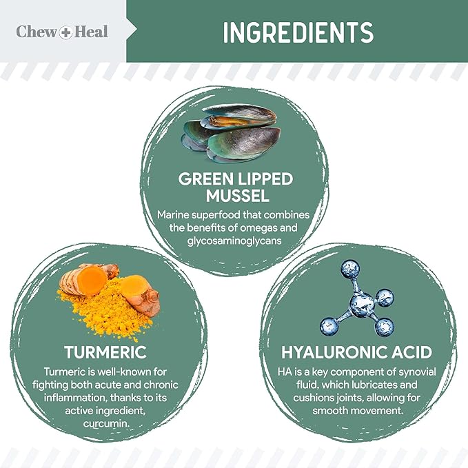 - Green-lipped mussels, yucca schidigera, turmeric, and omega-3 fatty acids help support joint health by reducing inflammation and improving mobility.