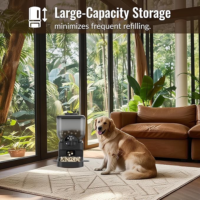 - 6L Large Storage for Dry Food and Multi-Portion Control The 6L electronic pets (animal) autofeeder food to feed a single cat for about 24 days, or 8 days (medium dogs breed) with precise automated dispensing. Easily manage feeding times via the app's timer feature.The self feeding cat food dispenser suitable for treats, kibble, or multiple cats homes.The sealed lid keeps food dry and, when paired with a desiccant, prevents moisture.
