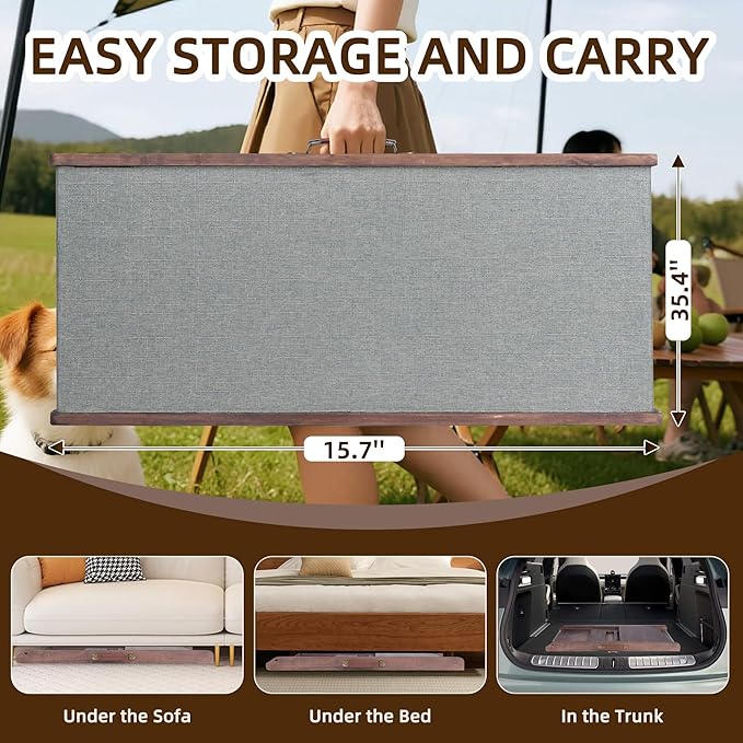 Folding Dog Ramp for Bed, Couch, Car, SUV & RV - Adjustable 4 Heights (12.2"-19.2"), 35.4" Long Wooden Pet Ramp with Non-Slip Mat & Safety Rails - Supports Pets up to 200 lbs