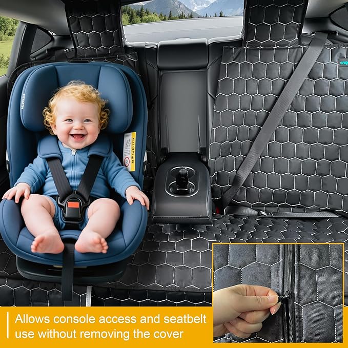 - Convenient Center Zipper Design:The center zipper allows flexible use of the back seat cover—easily fold down the middle armrest or cup holder when needed. All three seat belt buckles remain accessible, making it easy to secure child seats, buckle up kids, or accommodate multiple passengers. Whether you're traveling with kids, pets, or both, this rear seat cover helps maintain a clean, organized car interior for a worry-free family trip