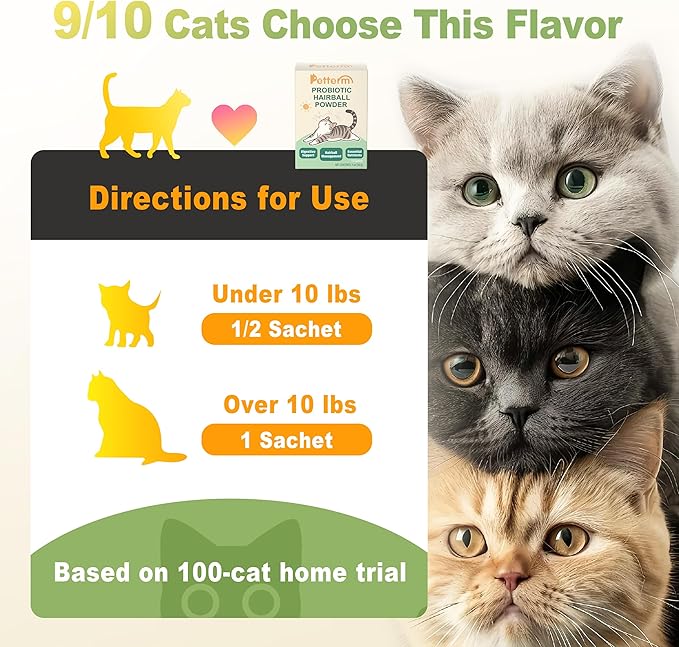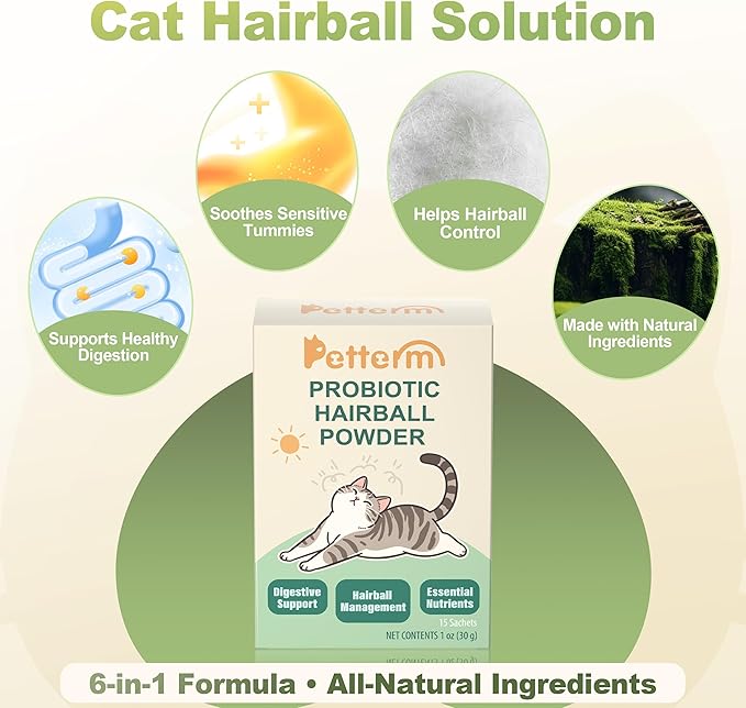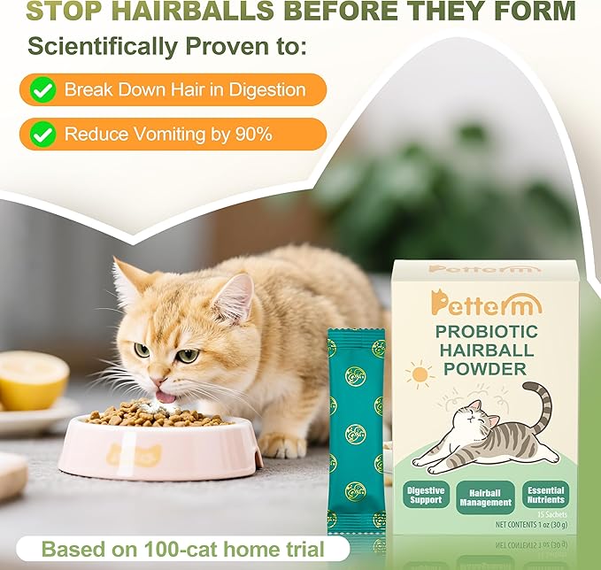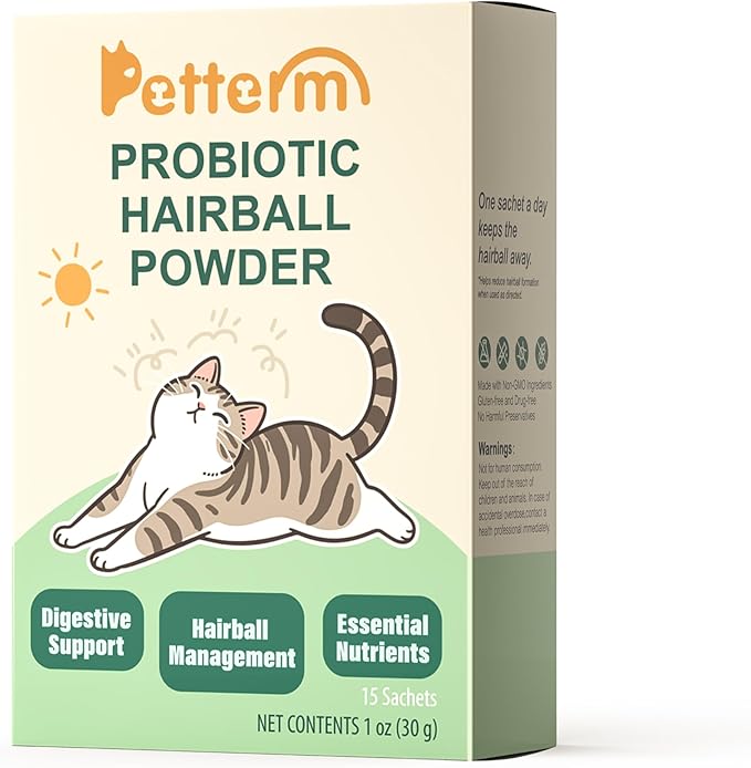 - Hydration & Usage Tip: To ensure optimal results, we recommend mixing each sachet with wet food and provide ample drinking water (ensuring your cat consumes at least 100ml of water daily). This helps the natural fibers from psyllium husk, slippery elm, and marshmallow root swell and work together to gently gather and transport trapped hair through the digestive tract. Adequate hydration supports the beneficial probiotics and prebiotics in maintaining healthy digestion. Note: During initial use, if insufficient water is provided, your cat may expel accumulated hair through vomiting—this is a natural process. Consistent hydration ensures comfortable and effective hairball passage thereafter.