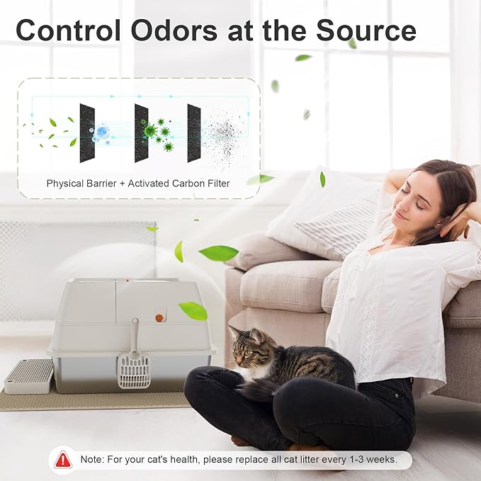 Stainless Steel Cat Litter Box with Lid, XL Extra Large Kitty Litter Box, Enclosed Top Entry Metal Litterbox for Big Cats, Easy Cleaning, Anti-Leakage & High Sided with Mat, Aisle & Scoop, Beige
