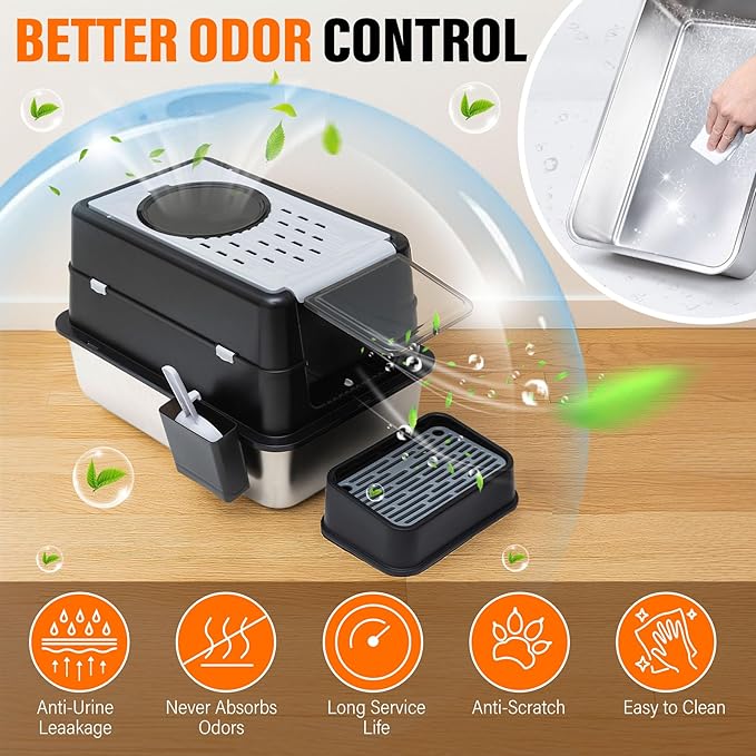 - Odor-Resistant Covered Steel Litter Box: Unlike plastic ones, this high side deep cat litter box boasts a smooth surface, and is waterproof, odor-resistant, scratch-resistant. Easy to clean,no need to scrub or scrape stubborn waste. Heavy-duty stainless steel build ensures durability and stability, preventing tipping. The package includes a litter scoop with holder, 4 silent non-slip pads on both the litter box and foot pedal protecting both the box and your floors.