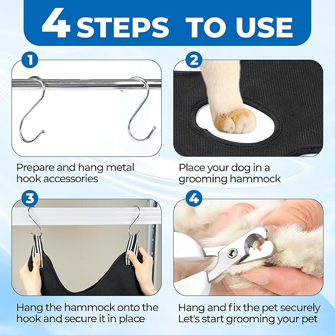 - Easy to Install and Use: Simply hang the grooming sling from a shower rod, door frame, or sturdy hook (S hooks included). The open design allows full access to paws, nails, and body for hassle-free grooming at home