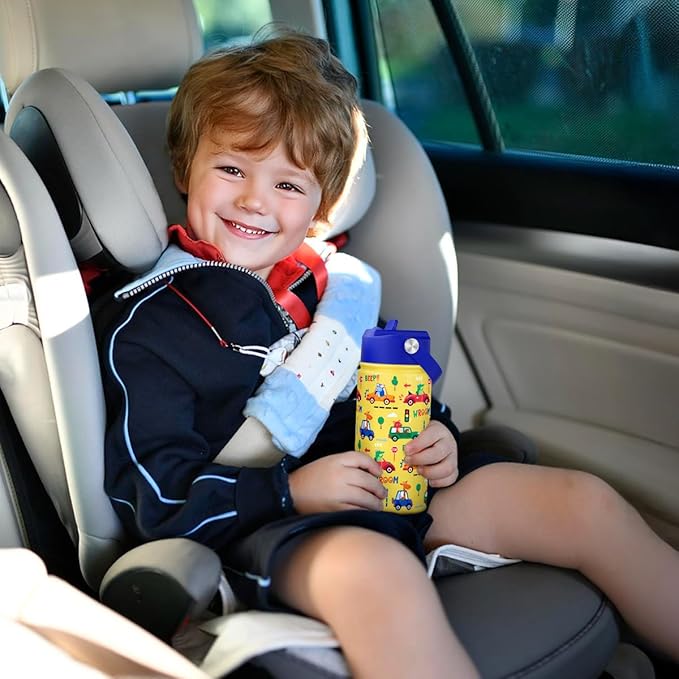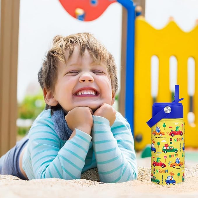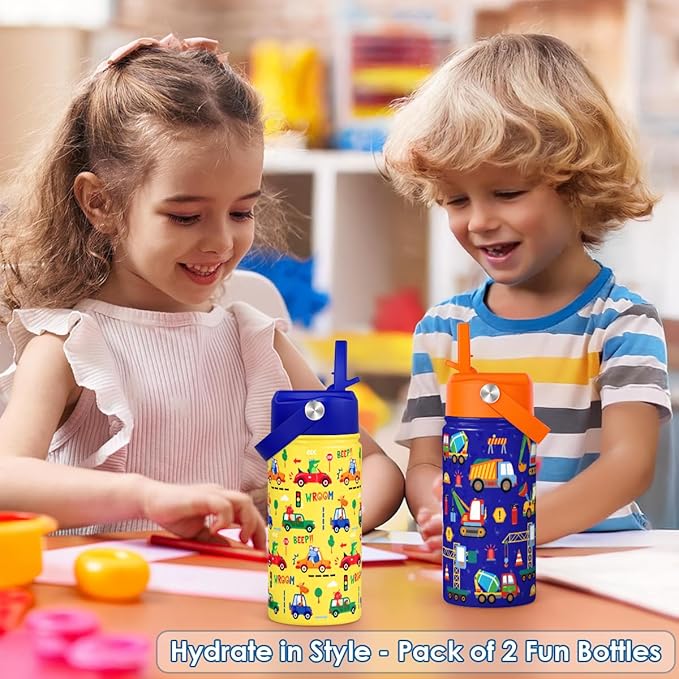 Kid Water Bottle 12oz with Straw Lid - 2-Pack Insulated Stainless Steel Water Bottles for Kids Boys Girls - Travel Cup for School Sports, Construction & Transportation