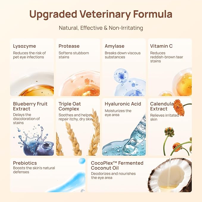 - 【Dual-Enzyme Power】Deep Cleans Stubborn Tear Stains, Protease & Amylase break down protein secretions & carbohydrate residues, dissolving pigment adhesion matrix 3X faster than regular wipes.