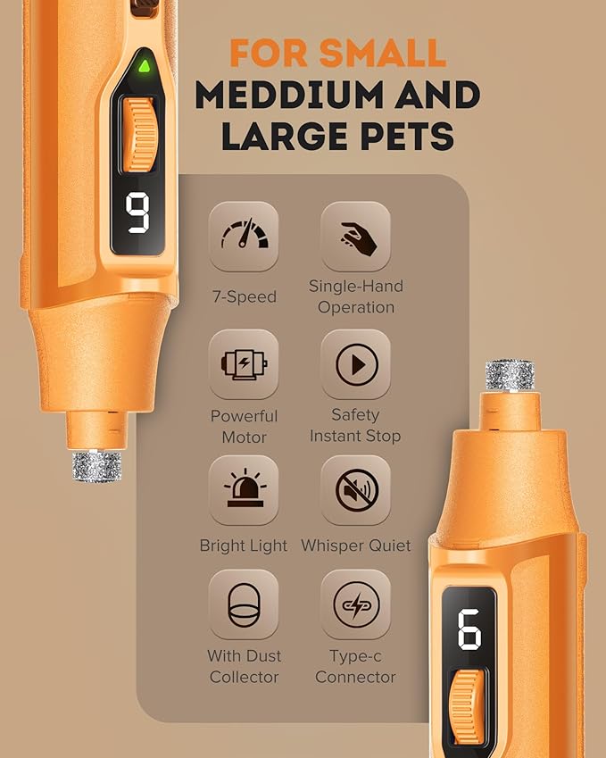 • 7 SPEEDS ADJUSTABLE: Ranging from 8,000 to 15,000 RPM, as one of the most powerful grinders, ideal for trimming the nails of small, medium, and large dogs, cats, birds, and other small animals