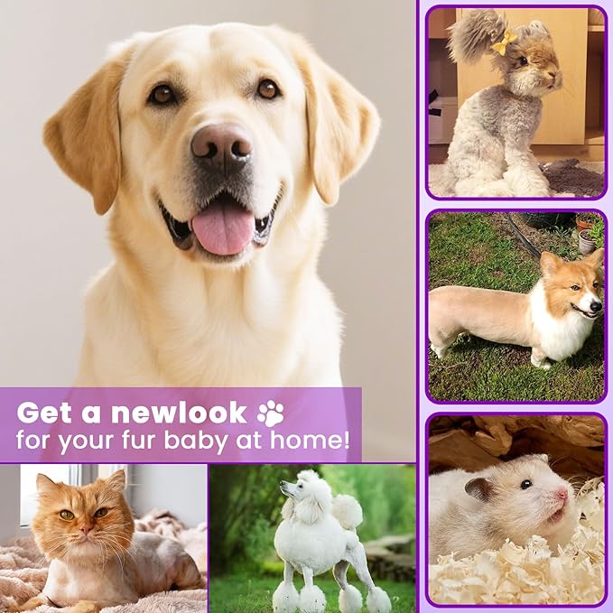 - [Powerful 7000RPM Motor] The upgraded pet hair trimmer features a high-speed 7000RPM motor, delivering powerful, stable power without overheating, even during extended trimming sessions. It easily handles thick and tangled fur while increasing trimming efficiency by 80%. Its low-vibration design is gentle enough even for puppies and those with sensitive nails. This dog trimmer is suitable for all pets, making grooming quicker and easier.