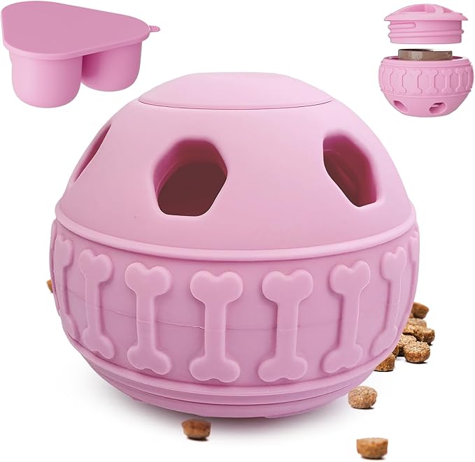 • 【Dog Slow Feeder Toy】: Plug the top hole with a silicone stopper to allow food to gradually leak out through the side holes. Dogs must roll or push the ball to get the food inside. This process not only provides healthy exercise but also significantly enhances your pet's intelligence and brain vitality, making it a great dog treat toy.