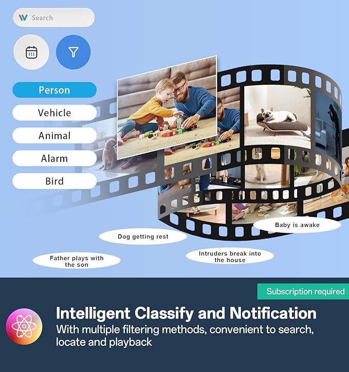 - 【Scenario AI Smart Classification & Search】: Our cámara de interior able to automatically identifies and categorizes the recorded videos into people, vehicles, pets, and alarms for easy search and playback according to keywards and date. Focus on key events, a straight-to-the-point notification, and act faster on alerts.ps:categorizes function require subscribed.