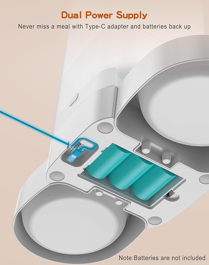 - [Dual Power Supply ] The timed cats feeder can be powered by USB power adapter and 3 alkaline D-size batteries (NOT Included). Once the feeding schedule is set, it is repeated every day. In the event of a power outage, the automatic feeder will automatically switch to battery power. For safety reasons, it is recommended to use Battery power sources. Battery alone can supply power for 200 days.No need to worry about your pet going hungry while you are away.