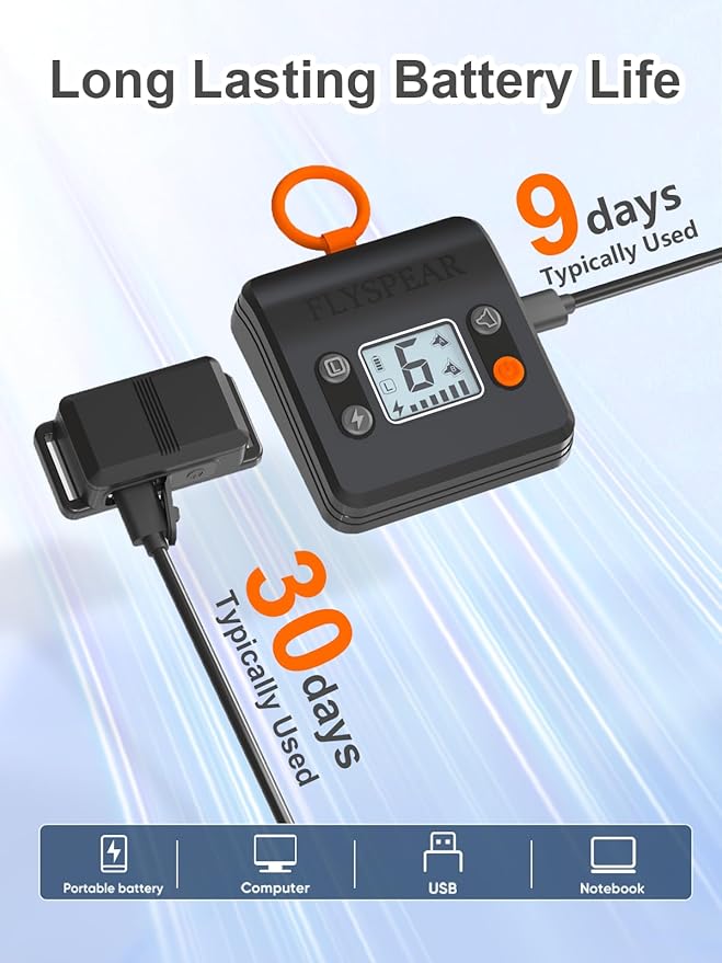 - Rechargeable & Long Battery Life:Unlike other barriers that require constant battery replacements or need to stay plugged in, FLYSPEAR wireless barrier is fully rechargeable. When fully charged, the transmitter can work for about 9 days and the collar can work for about 30 days.