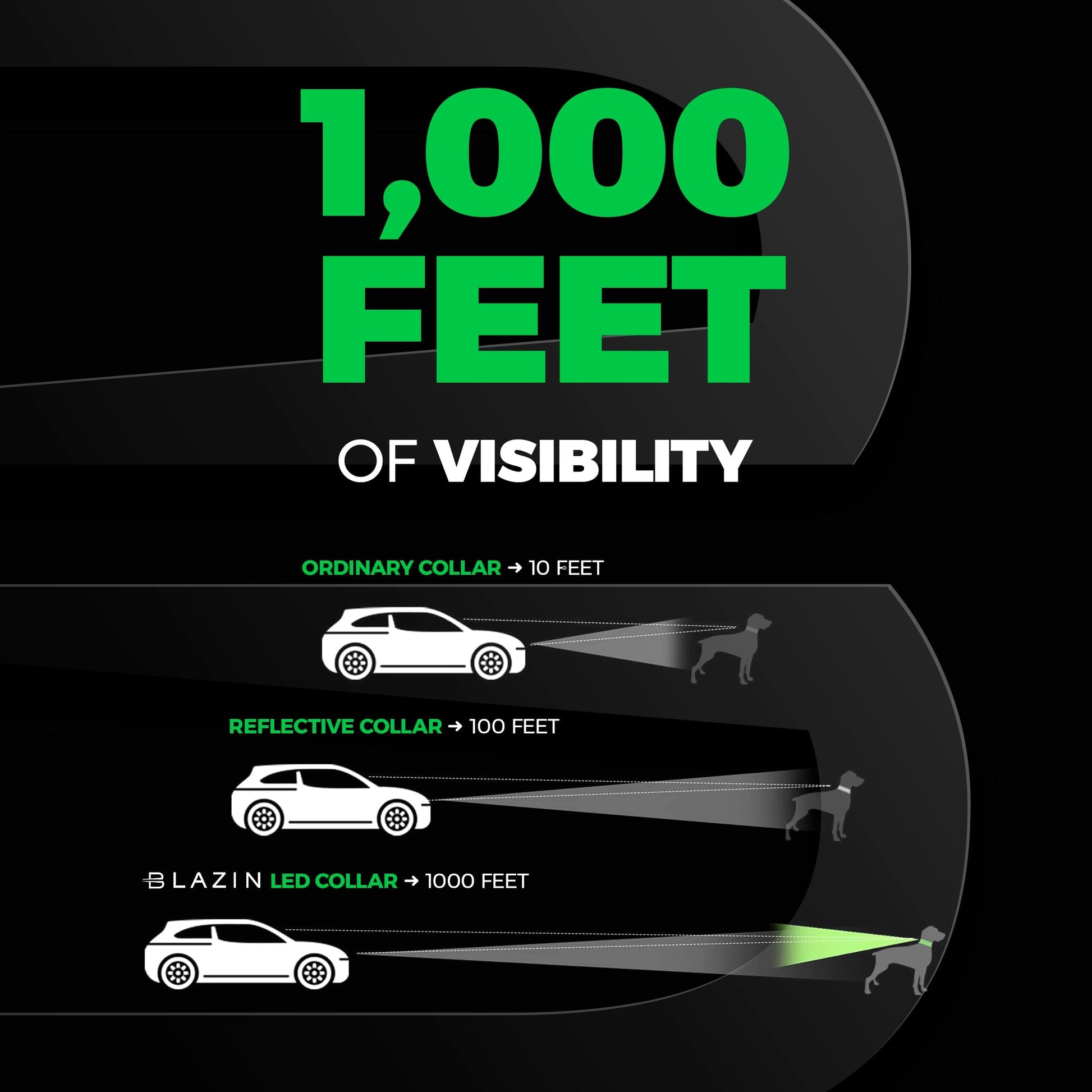 - SAVE YOUR DOG'S LIFE - Individual bulbs along the light up dog collars provide nearly 360 degrees of bright light, keeping your dog safe at night. Blazin LED dog collars offer an outstanding 1,000 feet of visibility so your pet is easily seen in the dark. Choice of three light modes (solid, fast blink, slow blink) with the push of a button.
