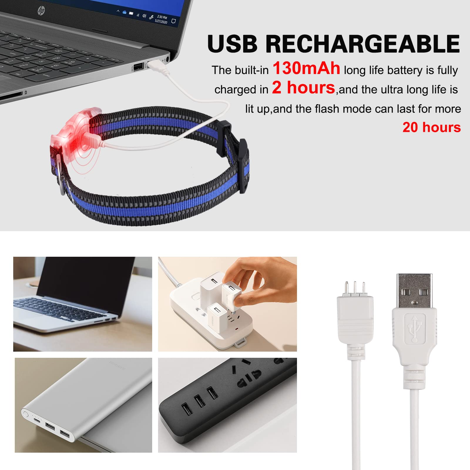 - 【USB Rechargeable】-The light up dog collars is equipped with a dedicated USB Rechargeable data cable,compatible with any USB device, your flashing dog collar can run for up to 10-20hours on a single charge, and can be recharged after use,no need to replace the battery,more environmentally friendly.