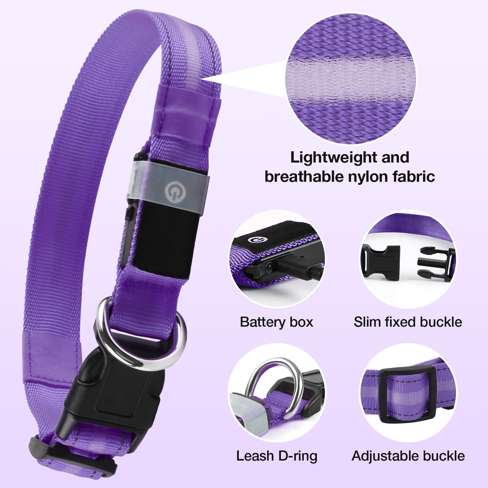 Fiveda Light Up Dog Collar, USB Rechargeable 6 Modes, Waterproof Charging Port, Long Lasting LED Collar - Adjustable Nylon Reflective for Dogs, Sizes S/M/L (7/9/11 Lights) -Purple, M