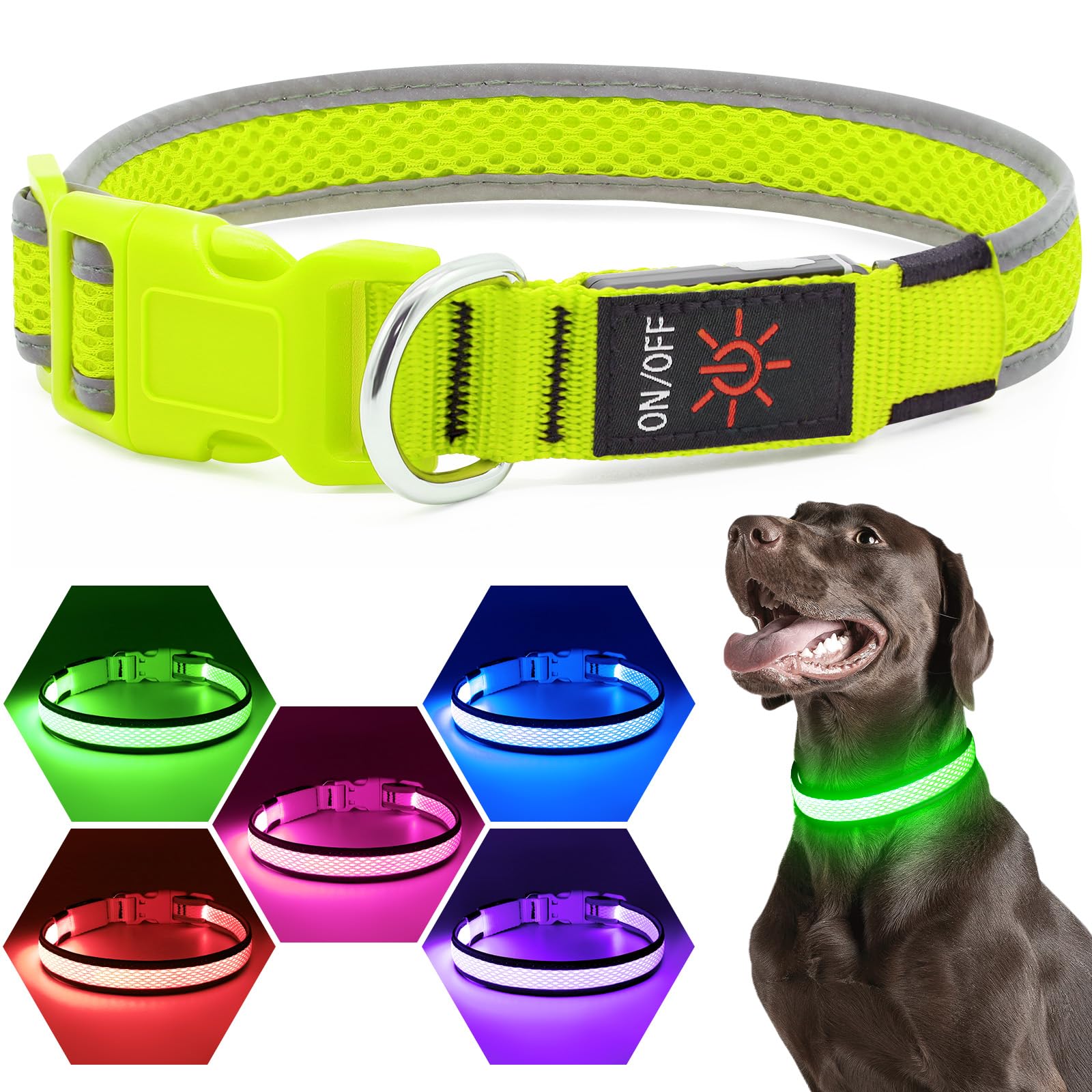 Flashseen LED Dog Collar, Light Up Dog Collar Lights USB Rechargeable, Adjustable Comfortable Soft Mesh Safety Collar for Small, Medium, Large Dogs(Large, Neon Green)