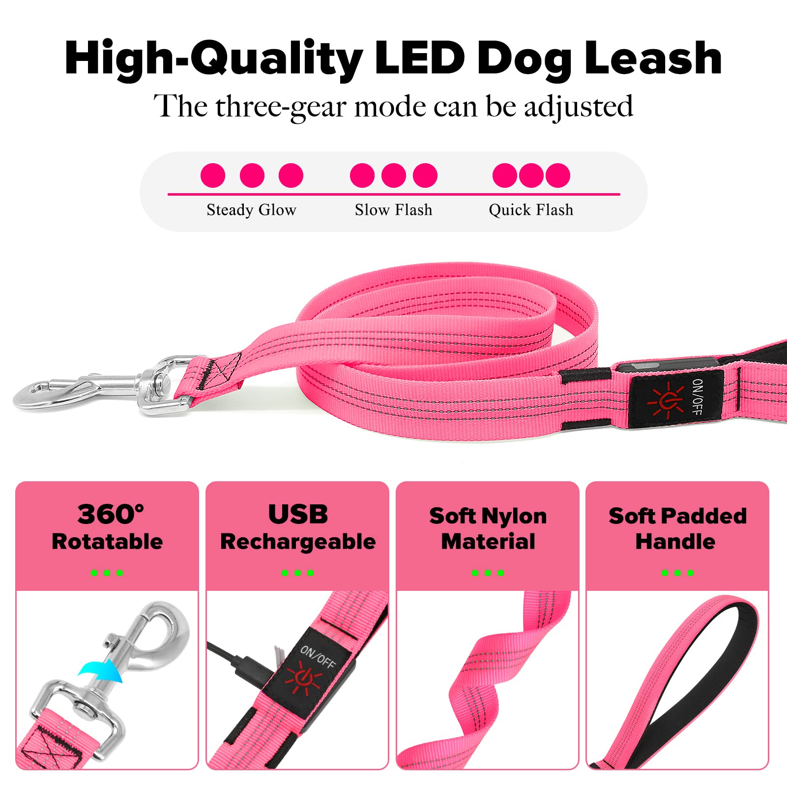 Illumifun LED Dog Leash - USB Rechargeable Light Up Dog Leash Glow in The Dark, Nylon Glowing Dog Lead for Your Dogs Walking (PinkⅡ)