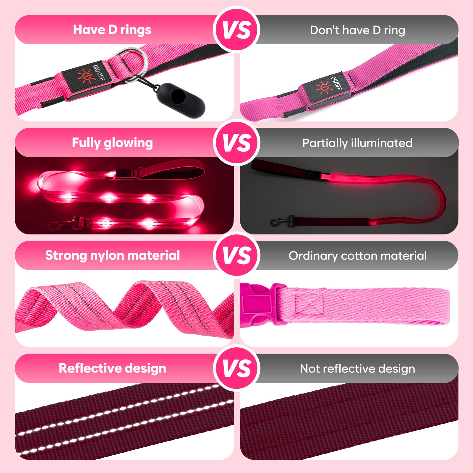 - 👍 PADDED HANDLE & 360°SWIVEL BUCKLE - The led dog leash's handle is padded with sponge to make your hands more comfortable when walking the dog. The 360° flexible safety buckle can be quickly released or attached to the our LED dog collar and harness.