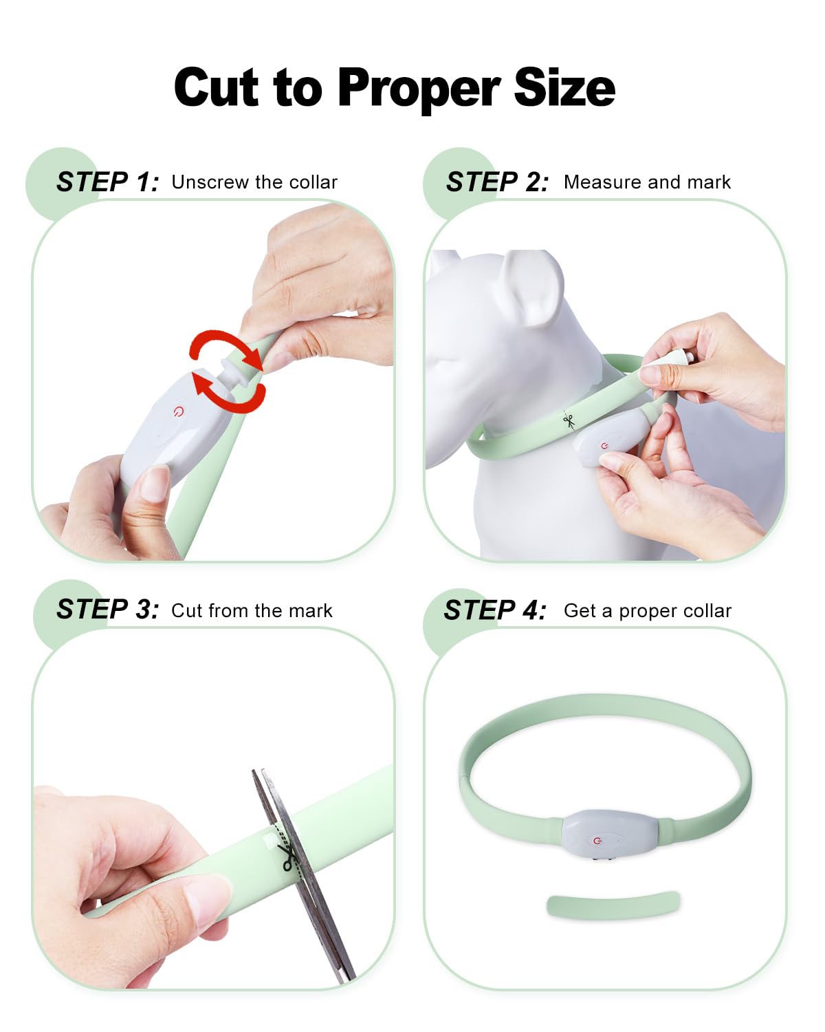 - Customizable Fit for All Pets Dog Collar: Dog Collar can be easily trimmed to fit any neck size suitable for all pets, providing a secure and snug fit. with a length of 64cm( 25.2in). Long press 3-5 Sec. to turn off and Short click to select lighting ways. Package Include: 1 X LED Dog Collar, 1 X USB Cable,1x user manua