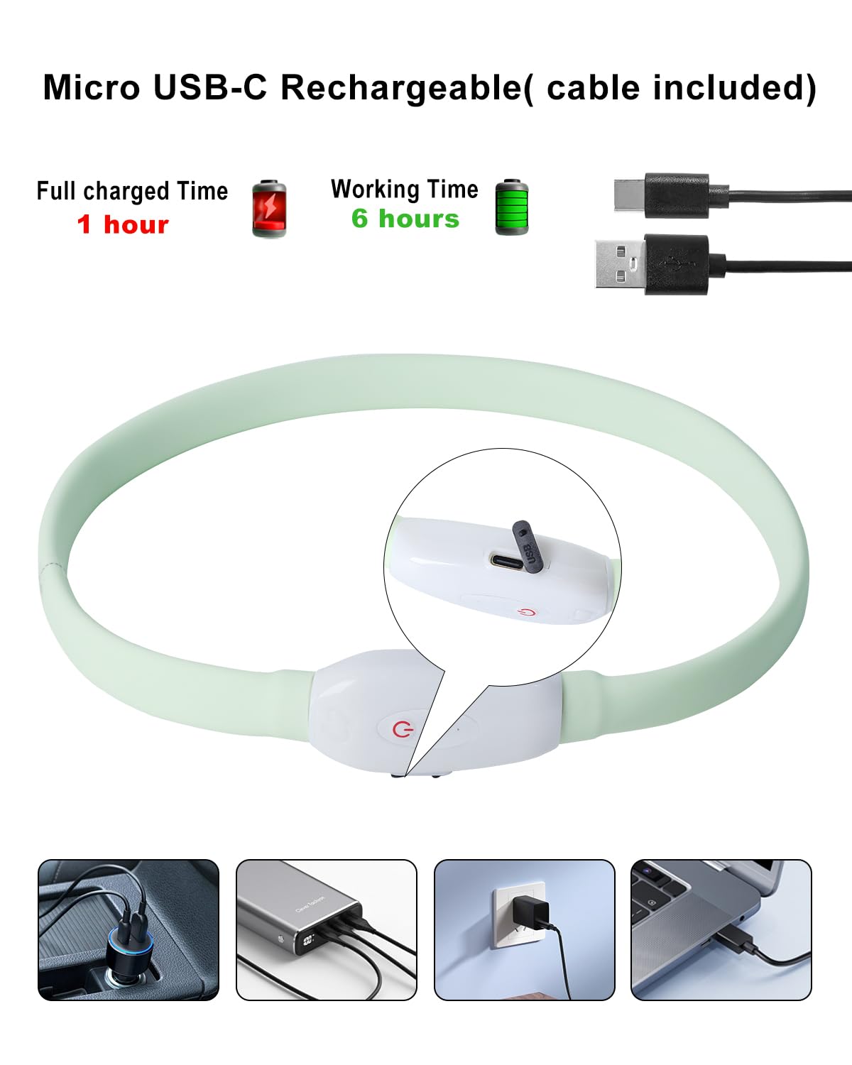 - High Visibility Safety Glow Dog Collars: This light up dog collar is designed to enhance the safety of your dog during nighttime walks or activities, as it glows in the dark and can easily be seen from a distance. The LED light is visible for approximately 500 meters (1640 ft) at night when it has enough charge