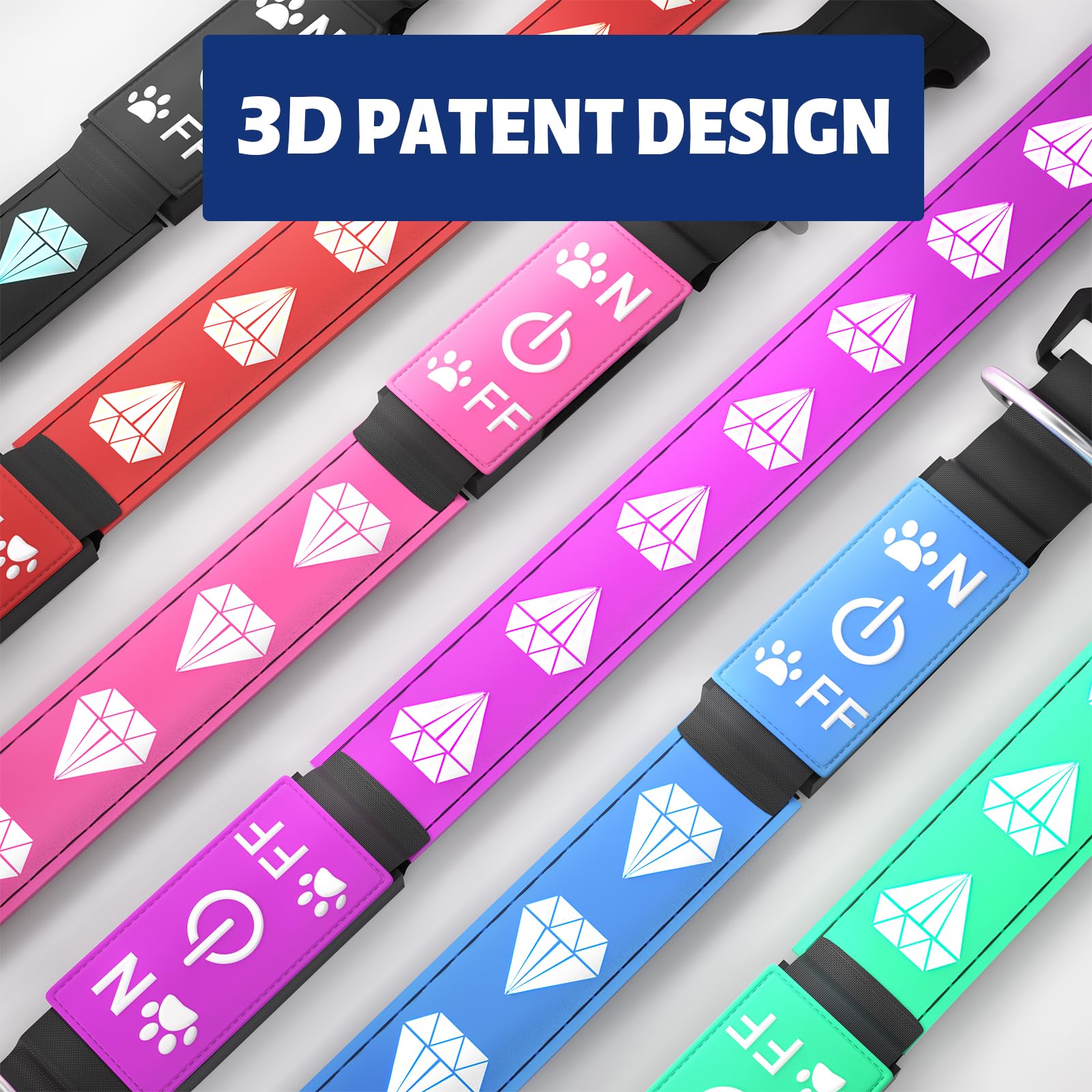 - 🐾【3D DESIGN & ADJUSTABLE】 - LED dog collar has special and cute 3D diamond patten design. Different with other LED strip design, also the leather collar is adjustable. Greater adjustable range to improve dog collar's usage rate.