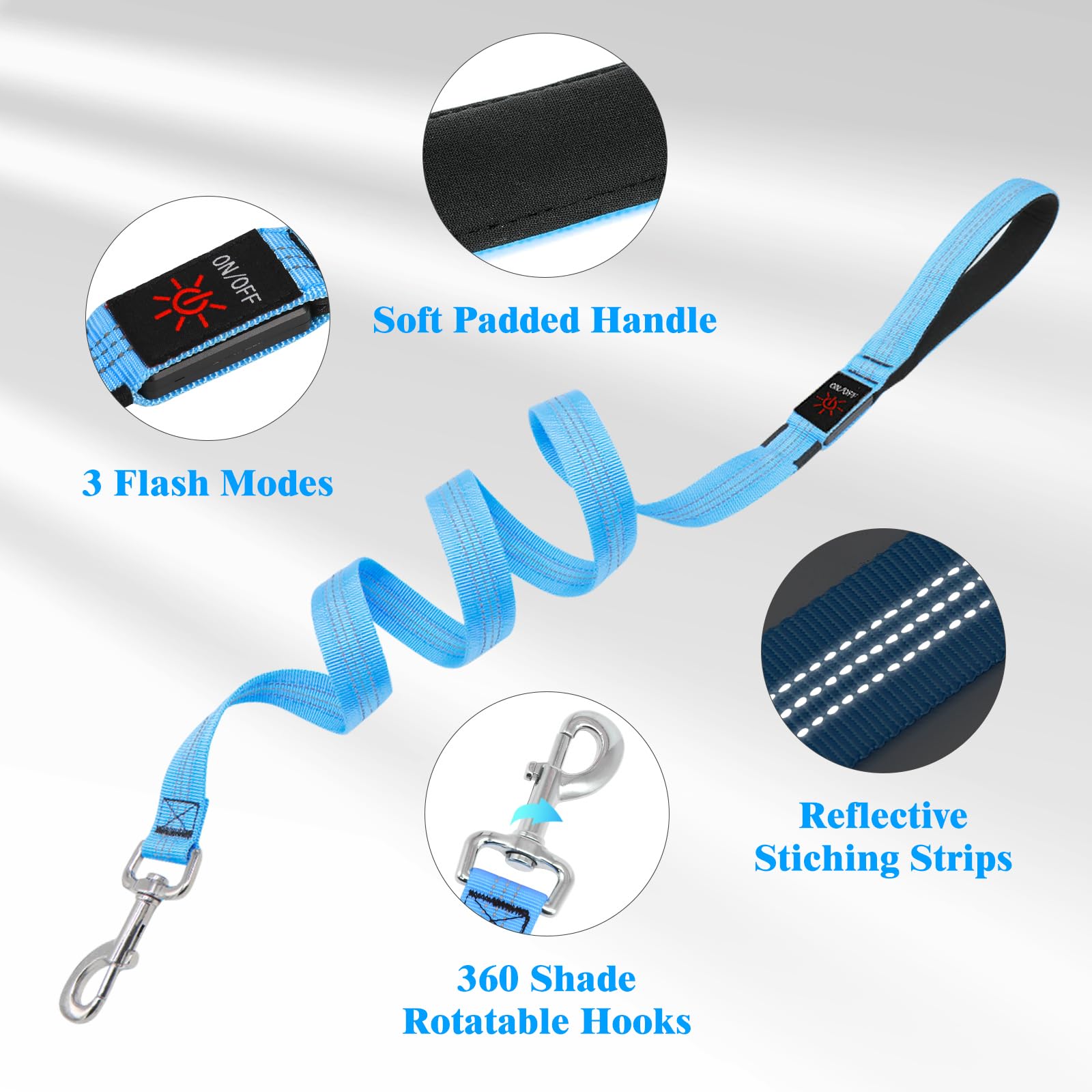 - REFLECTIVE -- Our light up dog leash is made of nylon webbing material, which sews three reflective strips on it. With a soft padded handle and D-ring, you may connect it to a dog collar or dog harness at no ease.