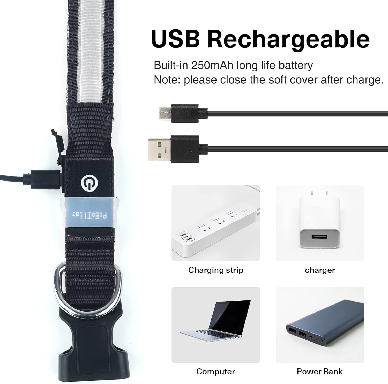 - Rechargeable Led Dog Collar: PcEoTllar dog collar is waterproof. No worries about the collar when your dog is swimming or playing under the water! Please close the Soft Charging Cover after charging and please stay away from sea-water. Rechargeable with any other daily USB device is more convenient, you will not paying for batteries anymore! Full power can last 10 hours.