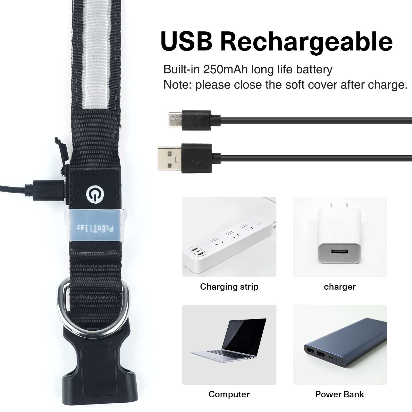 - ★Rechargeable Light Up Dog Collars: After upgraded, this lighted dog collar is adopted with standard Type-C charging port, which is more convenient to get it charged with no worry about losing the included charger. With built-in 250 mAh battery, the collar can lasts for 10H after a full charge in 2 hours.