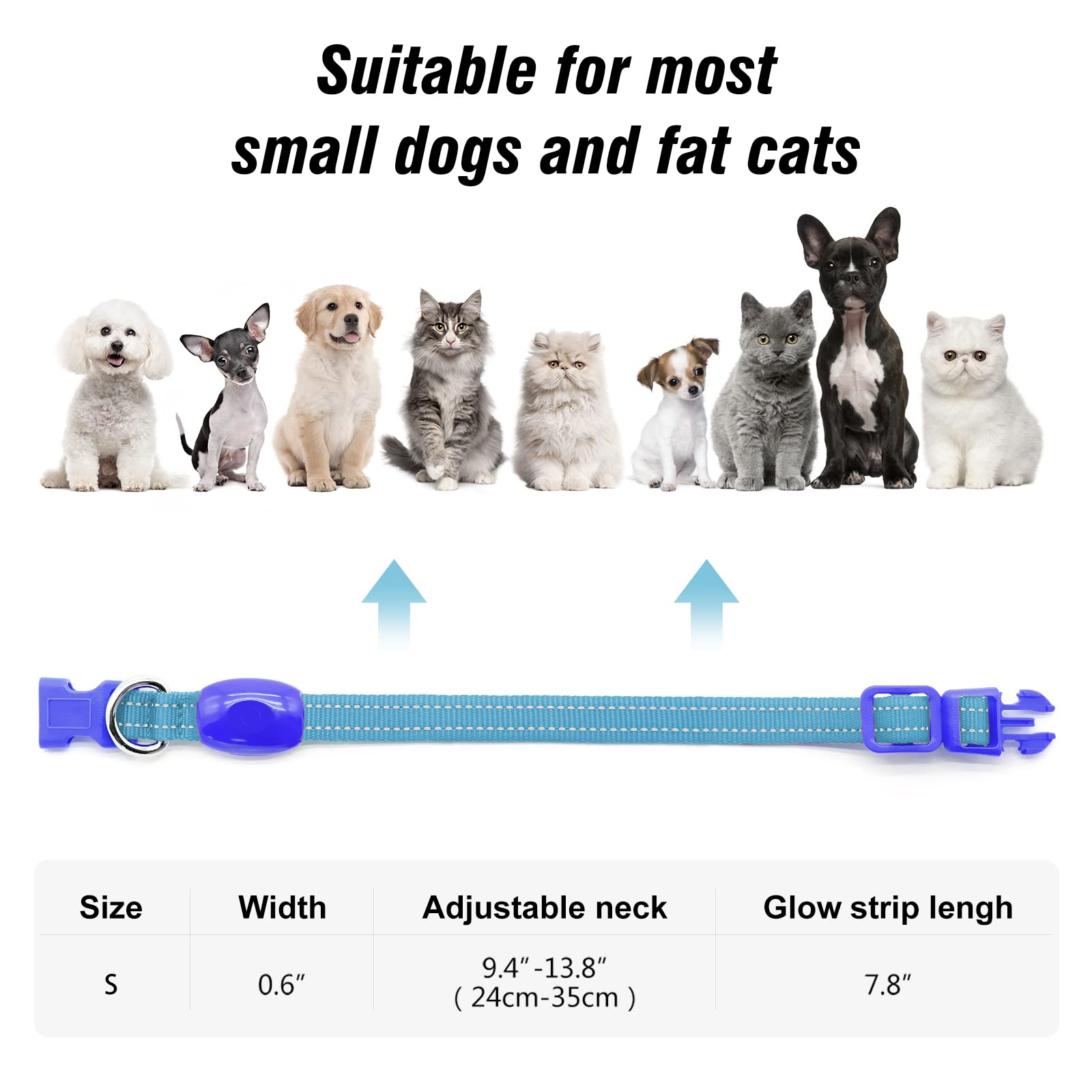 - FIT FOR SMALL PET:Total lenght is only 9.4”~13.8”(24~35cm)of our light for dog collar ,which is fully adjustable,reflective,well made and bright enough,such dog walking light is designed for small dogs like chihuahua,poodles,or cats. Please note that there is no breakaway buckle of the glow collar for dogs if using for cat.